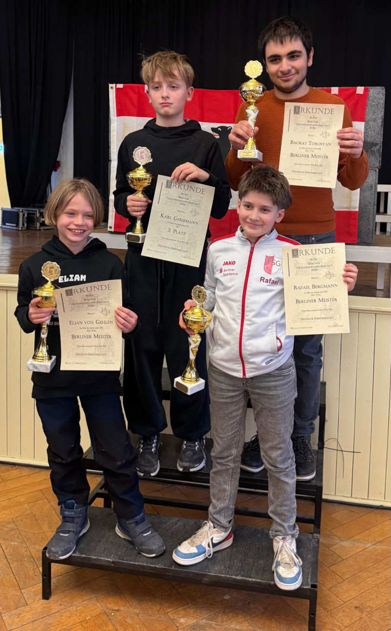 Bei der Berliner Jugendeinzelmeisterschaft 2026 hat unsere Jugend eindrucksvoll abgeräumt. Elian von Gehlen (U10), Rafael Antonio Bergmann (U12) und Bagrat Torosyan (U18) sicherten sich die Meistertitel in ihren Altersklassen, während Karl Gersemann (U14) einen starken zweiten Platz erreichte. Alle vier Spieler qualifizierten sich damit für die Deutsche Meisterschaft – ein großartiger Erfolg!.