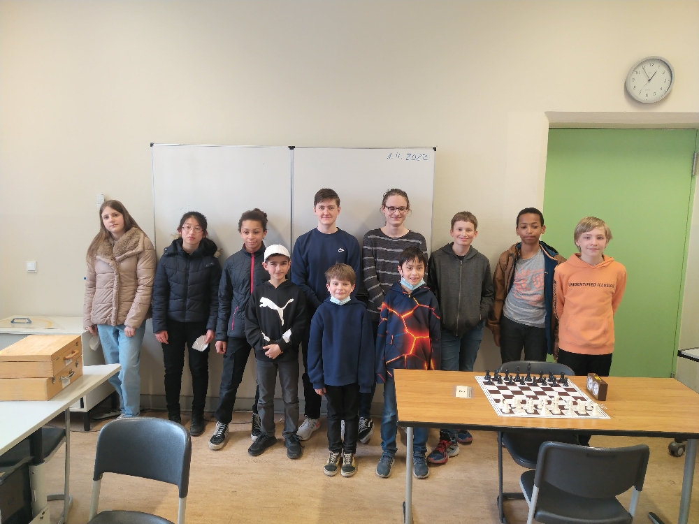 Kräftig durchgewechselt wurde in unserem ins Open gewechselte BJMM-U12-Team – Enno, Louis, Thao-Linh, Oliver, Patrick, Arthur, Karl H. und Florian teilten die vier Bretter untereinander auf. Und obwohl die Motivation in dem nicht DWZ-gewerteten Turnier vielleicht nicht bei allen ganz so hoch war, konnte das Team zwei Mannschaftssiege u.a. gegen das TSG-Mädchen-Team feiern.