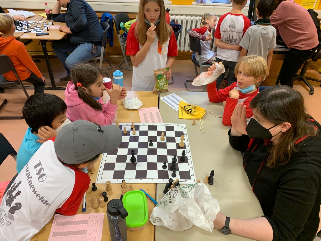 Auch für TSG 2 lief es in der Aufstellung Enno, Daniel, Oliver, Merja und Johann sehr gut. Das Team wurde in dem 15er-Feld sehr guter Sechster. Nach der Auftaktniederlage gegen WeDa 1 konnte es sich mit drei Siegen in Folge wieder sehr schnell in die Spitzengruppe einreihen. Mit einem Brett- und damit einem Mannschaftspunkt mehr im letzten Kampf gegen die Königsjäger wäre das Team sogar sicher auf dem Podest gewesen. Enno kämpfte am ersten Brett wie ein Löwe und hatte mit 1375 DWZ den mit Abstand höchsten Gegnerschnitt aller Teilnehmer. In mehreren Partien konnte er sich gegen seine deutlich stärkeren Kontrahenten lange seiner Haut erwehren, spielte dreimal die längste Partie der Runde und erspielt sich gute 1,5 Punkte. Fast-Namensvetter Ennio (DWZ 1467) konnte er das einzige Remis in diesem Turnier abringen. Ebenfalls eine sehr gute Leistung sind Daniels 3 aus 4 Punkte, womit er nur in der Auftaktrunde verlor und sich über stolze 50 DWZ-Punkte freuen kann. Etwas unter Wert verkauft sich Oliver, besonders weil er es bis zum Turnierende nicht schaffte, seine Schlagzahl zu reduzieren. So lässt die erste DWZ-Wertung noch etwas auf sich warten, denn seine zwei Punkte holte er sich gegen Spieler ohne Zahl. Merja, das einzige Mädchen des Teams, hat es in zwei ihrer vier Partien mit den Hammer-Gegnern Leyi Charlotte Zhou (WeDa) und Anker (s.oben) voll erwischt. Aus den restlichen zwei Spielen holt sie sich einen Punkt, womit auch für sie das Turnier ok ist. Eine große Überraschung war die Leistung von Johann, der seit Corona kaum und m.W.n. seit der DVM 2019 kein einziges Turnier gespielt hatte. Natürlich waren seine Gegner an Brett vier nicht die Allerstärksten, aber 3 aus 3 muss man erstmal machen.