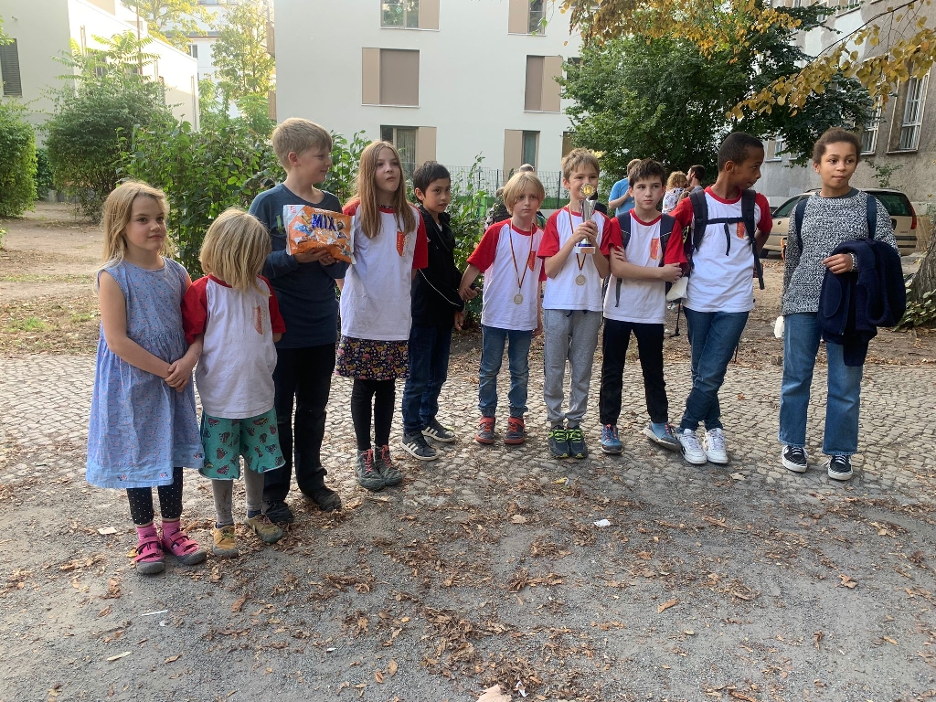 Mit zwei Teams waren wir in der U10 vertreten. Bei der Aufstellung von TSG 1 hatten die Trainer die Qual der Wahl, denn es gab mit Adrian, Enno und Daniel gleich drei Spieler, die hinter Khoi Bach, Karl und Khoi Vu für Brett 4 in Frage kamen. Die Entscheidung zugunsten von Adrian sollte sich lohnen, aber der Reihe nach. In der ersten Runde konnte die Erste die starke zweite Garde(z) der Weißen Dame mit 3:1 bezwingen – nur Khoi Vu musste wegen zu schnellen Spiels den Punkt an den Gegner abtreten. Durch eine sehr konzentrierte Leistung konnte die Überraschungsmannschaft des Turniers, die Spielgemeinschaft Empor/Kreuzberg, mit dem gleichen Ergebnis niedergerungen werden. Hervorzuheben sind vor allem die Siege von Karl gegen Kaderspieler (und Lieblingsgegner) Oleksandr Isaichykov sowie von Khoi Vu gegen den dänischen Shooting-Star Anker Müller (1545 ELO). Khoi Bach verlor leider in einer heißen Partie gegen den DEM-Teilnehmer Ennio Rodriguez Klasen. Eine klare Angelegenheit war das Drittrunden-4:0 gegen Chemie Weißensee. Vor dem vorentscheidenden Match gegen die Setzlisten-Ersten Weiße Dame 1 lagen wir trotz dieser drei Siege nur auf Platz 2, denn die Favoriten hatten noch mehr Brettpunkte eingesammelt – für den Titel musste also ein Sieg in Runde 4 her. Leider ging es nicht gut los, denn Karl versemmelte seine klare Gewinnstellung mit zwei oder drei Bauern mehr, verlor recht schnell gegen die DEM-Dritte Yiyi Xiao und war entsprechend zerknirscht. Aber Adrian und Khoi Vu holten das glühende Eisen aus dem Feuer und gewannen gegen ihre nominell leicht favorisierten Gegnerinnen. Nun hing es an Khoi Bach, der es mit seinem Kaderkollegen Aakrit Seth zu tun hatte. In einem harten Fight holte er schlussendlich den erlösenden halben Punkt. Aber da man den Tag nicht vor dem Abend loben soll, musste auch in der letzten Runde noch einmal mit voller Konzentration gespielt werden. Gott seid Dank leisteten die stark eingeschätzten Borussen nicht so viel Gegenwehr wie erwartet. Mit dem abschließenden 3,5:0,5-Erfolg konnte sich DIE MANNSCHAFT über die Verteidigung des Titels aus dem letzten Jahr freuen. Herzlichen Glückwunsch !!! Falls es untergegangen sein sollte, Adrian holt sagenhafte 5 aus 5 Punkte und wird damit zum Garant des Team-Erfolgs. Beim nächsten Turnier wird seine DWZ mehr als 100 Punkte höher sein.