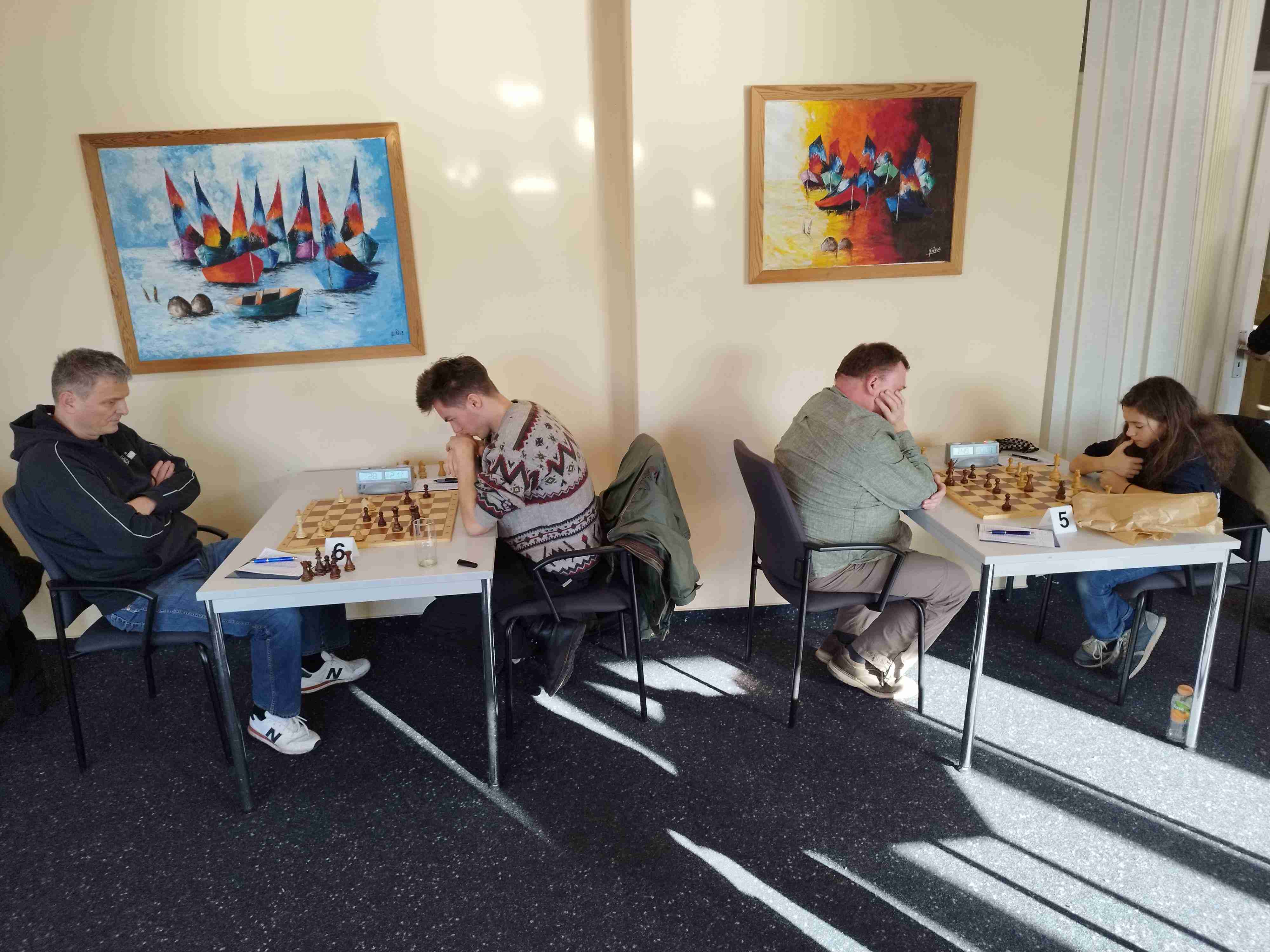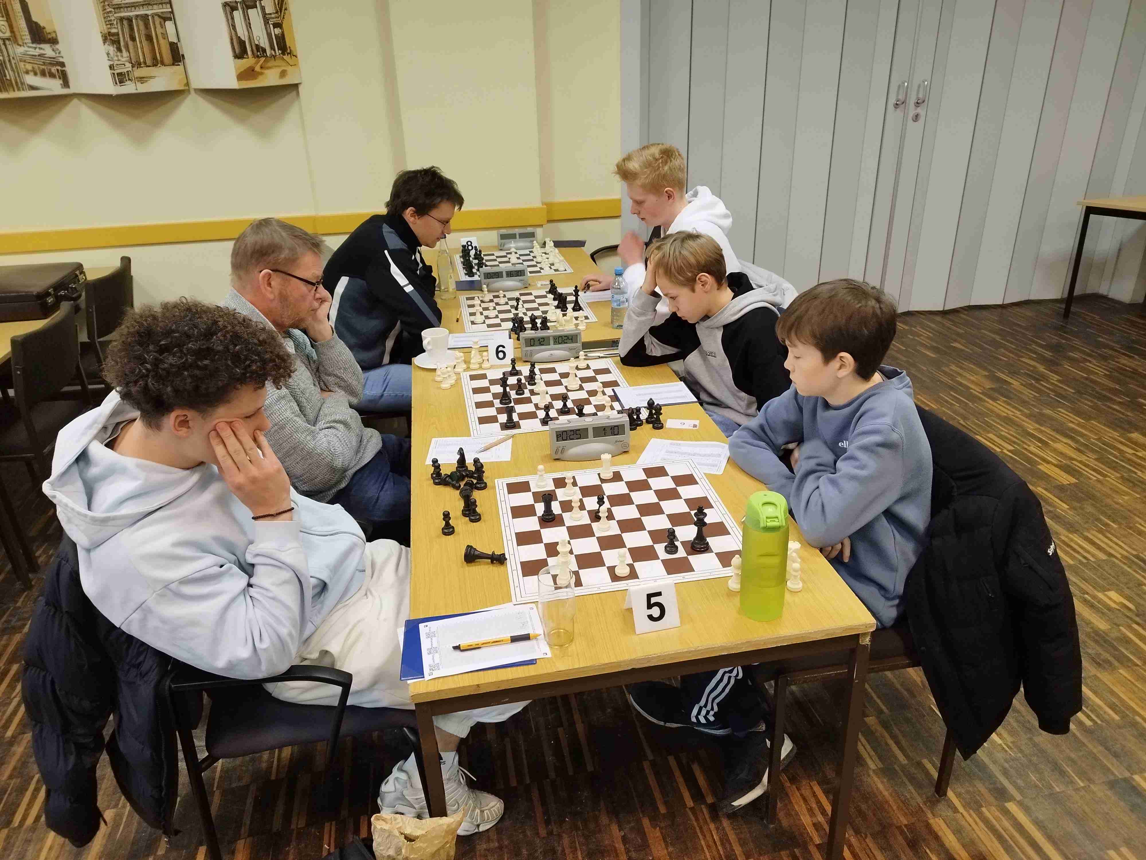 Das erste Brett mussten wir kampflos abgeben, da Jense kurzfristig wegen eines Infektes ausfiel. Friedrich spielte dann in einer Russisch-Variante gegen einen 400 DWZ-stärkeren Gegner das erste Remis am Brett 7 ein. Danach ging es mit einem Schwarz-Remis am Brett 2 von Vater Knut weiter, der 300 DWZ-stärkere Gegner konnte den leichten Raumvorteil nicht verwerten. Am Brett 3 gab es ein Remis, da die vielen Matt-Drohungen des Gegners nur mit einer sauberen Verteidigung der zweischneidige Stellung verwerten hätte können - schade. Lutz am Brett 4 verteidigte sich mit Schwarz 4h lang erfolgreich gegen einen fast 300-DWZ stärkeren Gegner. Theodor konnte am Brett 6 das remislastige Endspiel diesmal nicht halten, aber Endspieltraining macht den Meister, auch gegen stärkere Spieler. 2:4 für Zugzwang 1 🙁