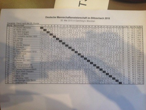 Soeben beendet wurde die Deutsche Blitzmannschaftsmeisterschaft in Garching. Mit Platz 19 blieben wir ( Christian, Matzel, Jense und Ditsche ) wohl im Bereich des Möglichen?! Herzlichen Glückwunsch an den neuen Deutschen Meister (nicht nur im Fussball), Bayern München!