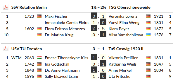Unsere Frauenmannschaft hat heute beim SSV Rotation einen verdienten 2,5 : 1,5-Auswärtssieg eingefahren und damit den nächsten großen Schritt gemacht. Doch es kam noch besser: Der Mitfavorit Coswig musste sich überraschend deutlich mit 1 : 3 gegen Dresden geschlagen geben.