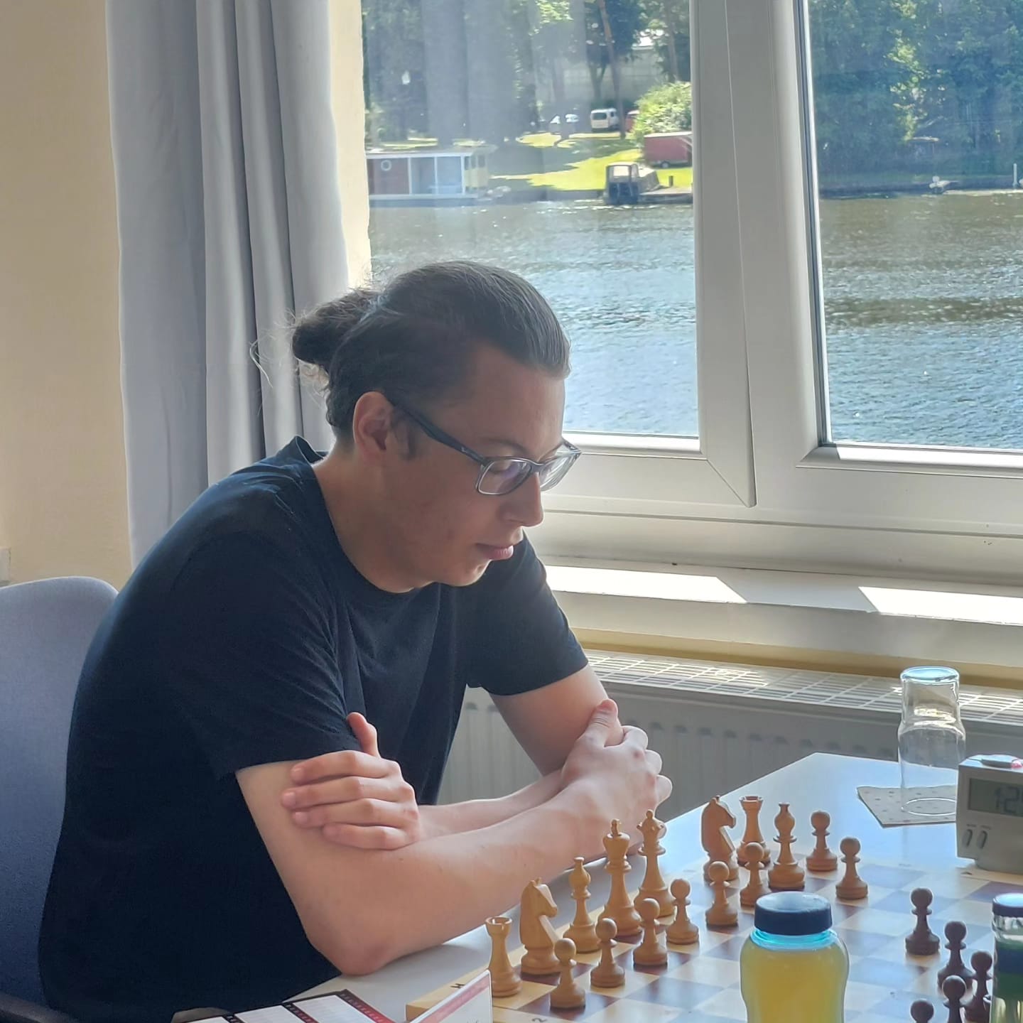 Luca war in der gesamten Saison eine sichere Bank in unserer Mannschaft. Mit 5/6 ist er zudem unser Topscorer bisher in der Saison. An Brett 1 mit Schwarz spielte er es in gewohnter Manier solide runter und kam in eine leicht angenehmere, aber ausgeglichene Stellung. Nach Konsultation mit dem Mannschaftsleiter und Begutachten der anderen Bretter nahm er das Remisangebot an und beendet die Saison ungeschlagen mit 5,5/7 und kann sich über einen DWZ-Gewinn von 25 Punkten freuen.