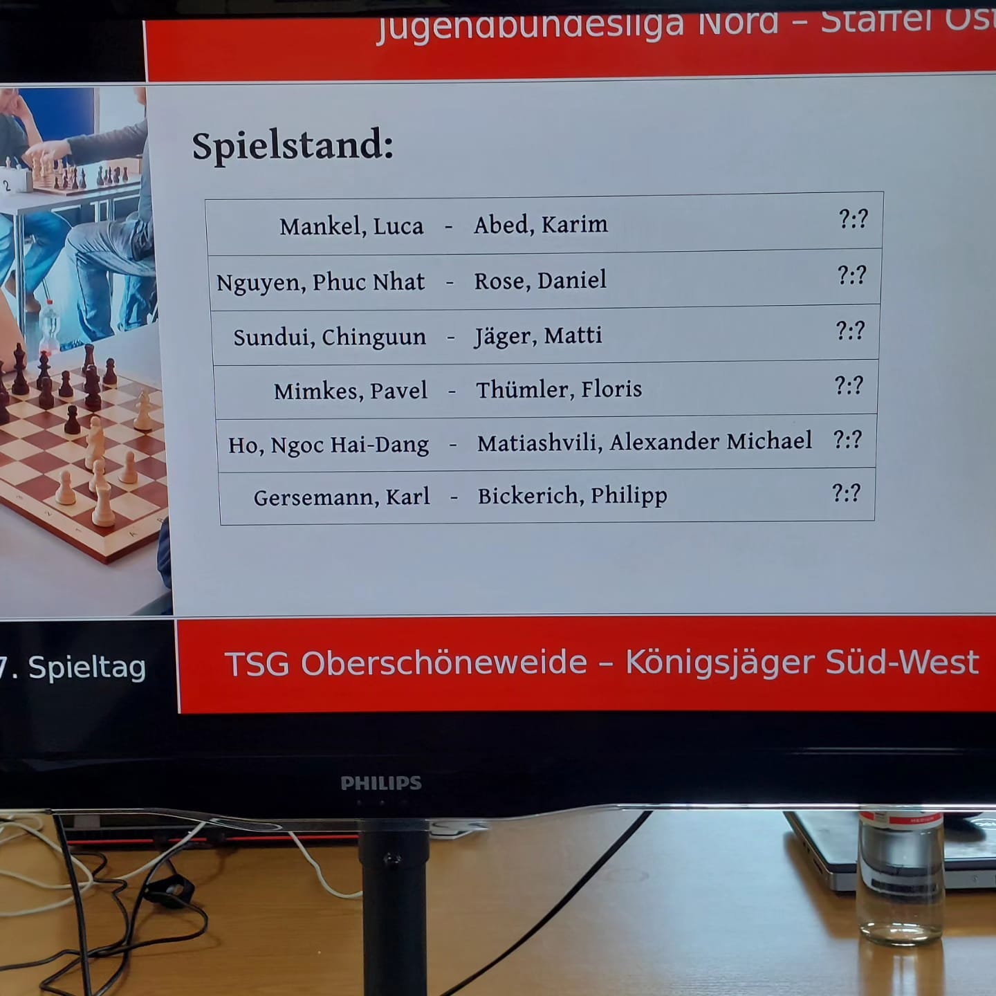 So kommen wir zur heutigen Ansetzung. TSG gegen die Königsjäger. Eine Niederlage aus der Vorsaison, die noch tief in meinem Kopf sitzt. Und heute ist unser Ziel ganz klar. Wir wollen gewinnen. Wir wollen uns rächen. Und wir wollen zur Deutschen Vereinsmeisterschaft u20 fahren. 5 Siege, 1 Niederlage und 23 Brettpunkte haben wir diese Saison auf dem Konto. 12 verschiedene Spieler*Innen kamen zum Einsatz und wir haben die beste Ausgangslage. Mit einem Sieg gegen die Königsjäger sind wir sicher zur DVM qualifiziert, bei einem Unentschieden würden wir etwas Schützenhilfe von den Borussen aus Lichtenberg brauchen.