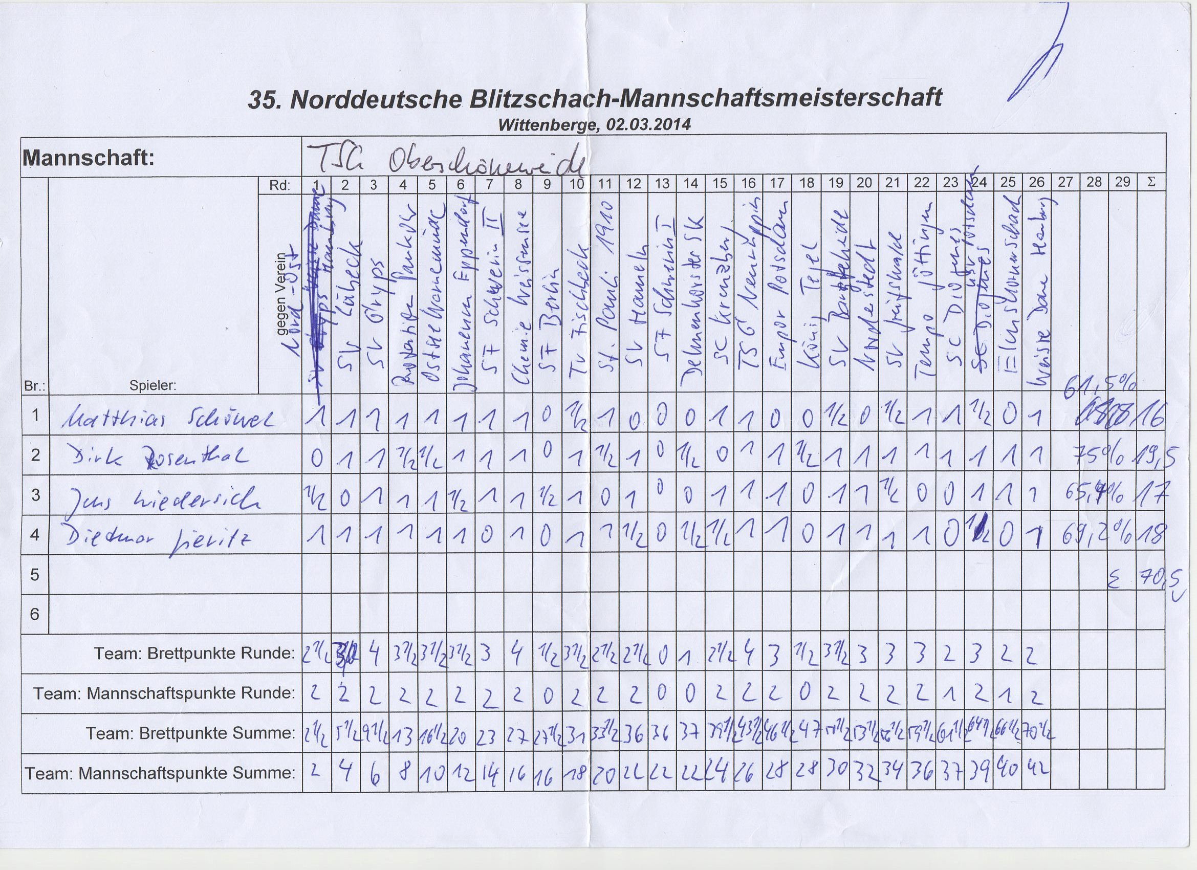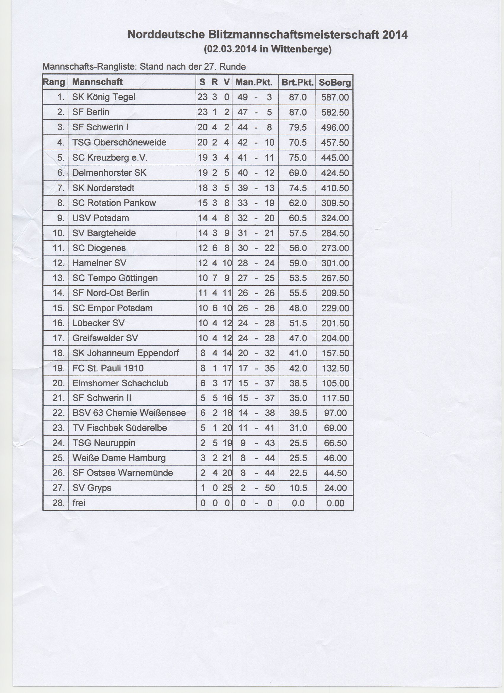 Mit knapp 30min Verspätung startete das Turnier und unsere Mannschaft pflügte die ersten hohen Siege und mußte sich nur dem Titelfavoriten SF Berlin geschlagen geben. Nach der Pause kam die Mannschaft wieder gut in Fahrt, um dann vom Gastgeber SF Schwerin I und dem Delmenhorster SK abrupt gebremst zu werden. Gegen Kreuzberg zeigte Jens beim Stand von 1,5:1,5 wie abgezockt man König/Randbauer gegen König/Springer zum (Mannschafts-) Sieg trägt. Mit dem Wind in den Segeln ging es nächsten beiden Runden mit Volldampf auf den späteren Turniersieger und Norddt. Blitz-Mannschaftsmeister König Tegel zu. Und wieder eine abrupte Bremsung... Obgleich bereits klar war, daß Qualifikation und Vorberechtigung nur schwerlich noch zu vergeben sind, wenn die Mannschaft nicht völlig einbricht. Der Endspurt über die letzten 8 Runden war dann ein leichtes, obgleich noch zwei Remis dabei waren. Vielleicht ein konditioneller Tribut?! Jedoch auch zwei Mannschaftspunkte mehr hätten die Mannschaft nicht auf den 3 Platz geschoben, da dennoch 4-5 Brettpunkte gefehlt hätten.