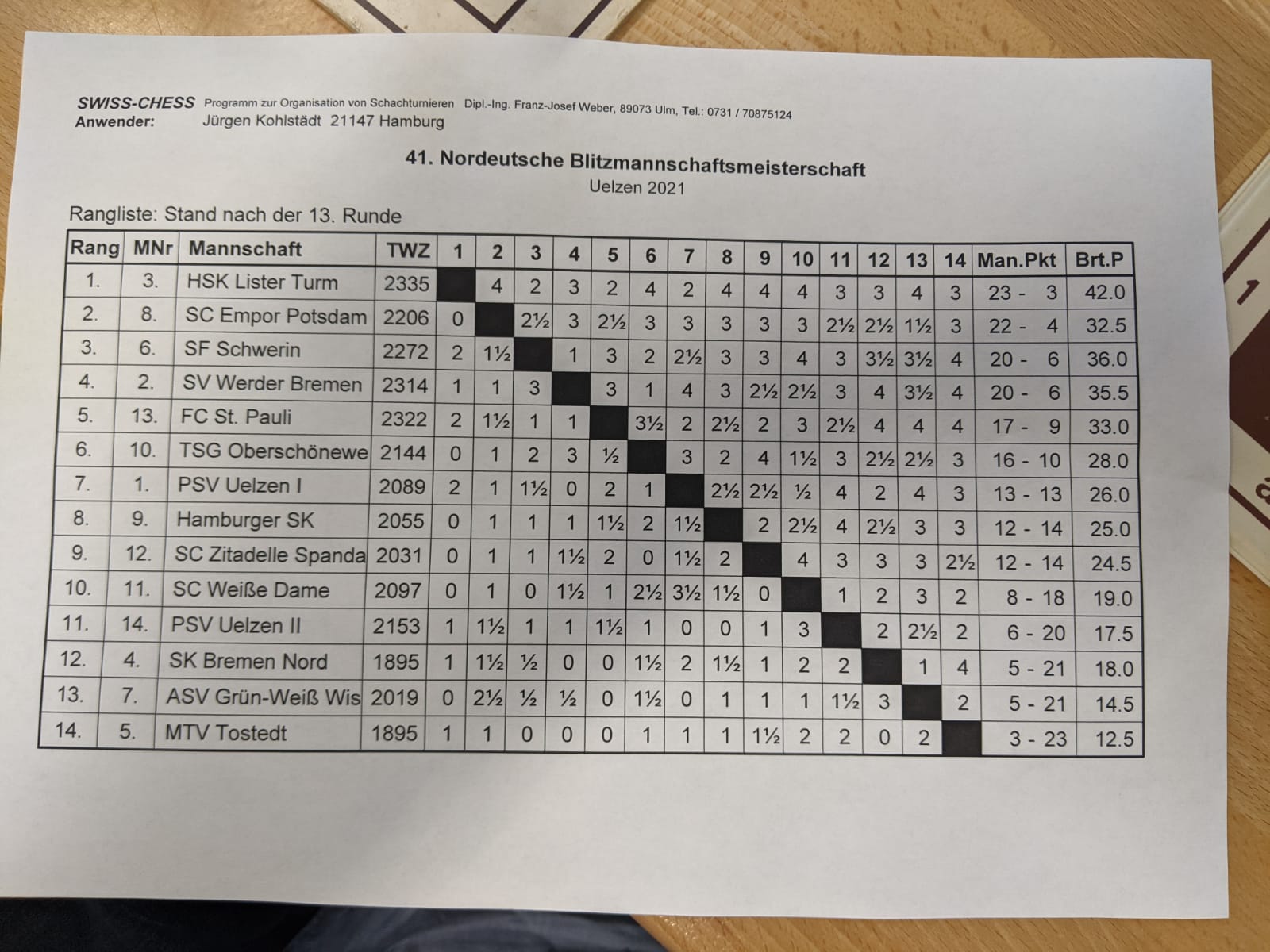 Paul war der Debütant bei einer Norddeutschen Blitz-Mannschaftsmeisterschaft, was ja auch einer der Günde war, warum er sich für den "Hammer an der Spree" entschieden hat. Und mit 1,5 aus 2 und zwei soliden Mannschaftssiegen kam unsere Mannschaft gut ins Turnier. Während Dietmar mit der Zeiteinteilung und seinen Partien im Allgemeinen haderte. Paul sprach ihm Mut zu, dabei muss es dann von Paul auf Dietmar übergesprüngen sein. 5 aus 6 bei Dietmar und Paul nahm eine Auszeit. Die Niederlage in Runde 4 gegen Weiße Dame wurmte Matzel mächtig und vom FC St Pauli bekam man die zweithöchste Niederlage gleich danach eingeschenkt. Dafür gelang gegen Werder Bremen ein überraschender Sieg und Matzel freute sich über einen bezwungenen GM. In Runde 11 sollte man eigentlich wissen, in welcher Reihenfolge man spielt. Nicht so Zitadelle Spandau, die ihre Niederlage noch in einen 0:4 verwandelten. Der Sieg gegen Uelzen I in der vorletzten Runde löste das einzige Berliner Ticket zur Deutschen Blitz-Mannschaftsmeisterschaft. Die Klatsche von HSK Lister Turm auf der Ziellinie war für die Gallerie. Rosi und Matzel spielten an den vorderen Brettern so vor sich hin und es ist eine Freude dabei zuzusehen! Am Ende waren die alten Recken mit um die 60% unterwegs und der Jüngste im Team hat noch Luft nach oben.